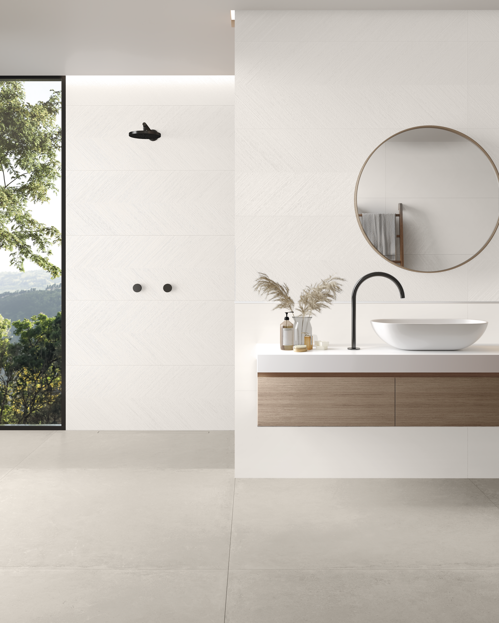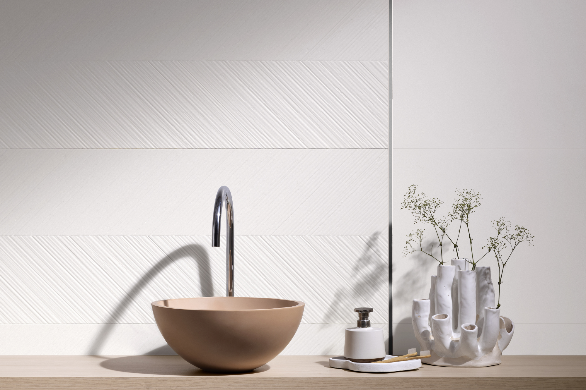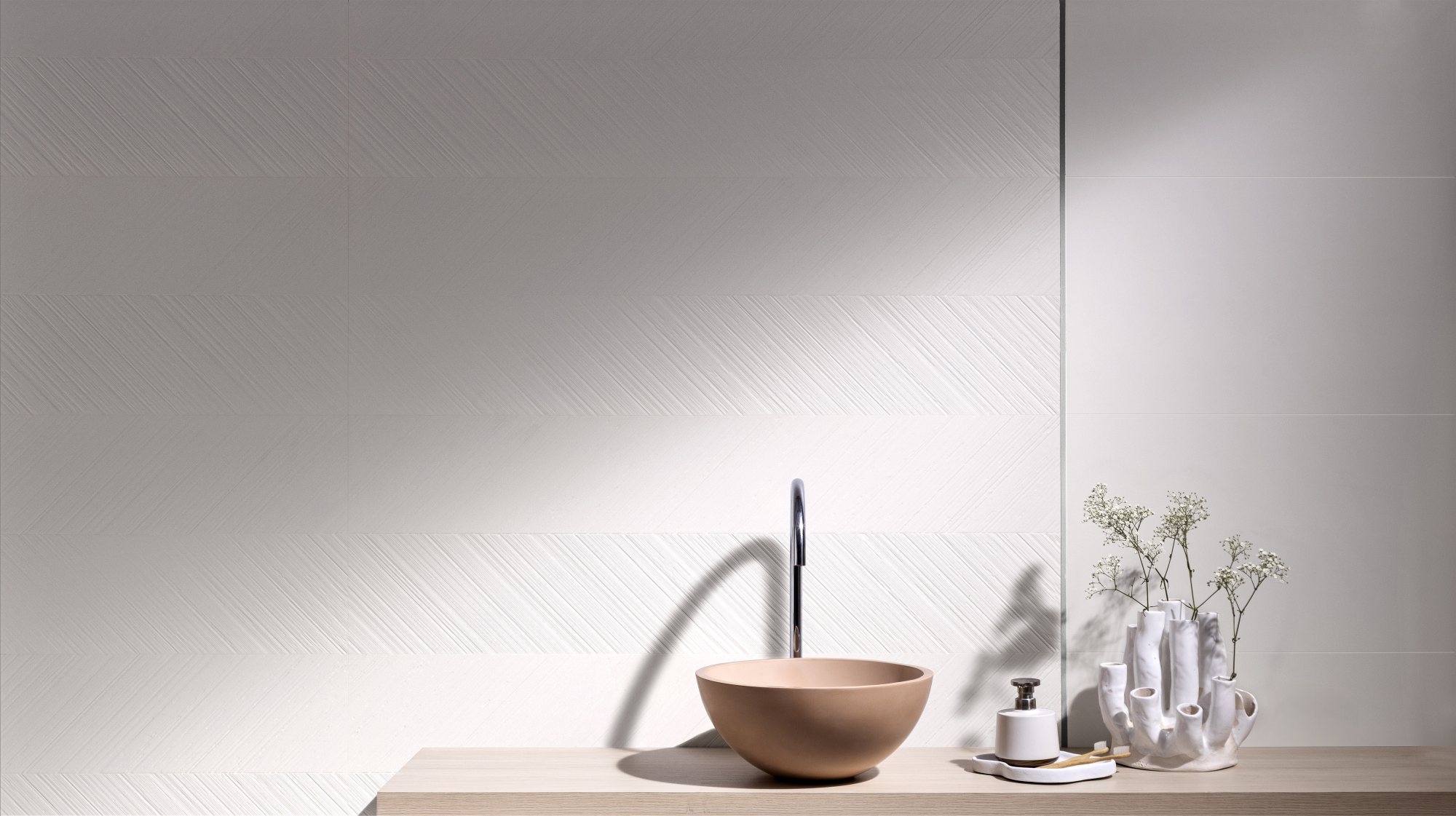 A timeless encounter of monochromatic tones, where versatility is the dominant note and the reliefs are the true protagonists. With long, tapered lines, they connect with all spaces. In a matte finish, the textures awaken a smooth and sophisticated dynamism. And the