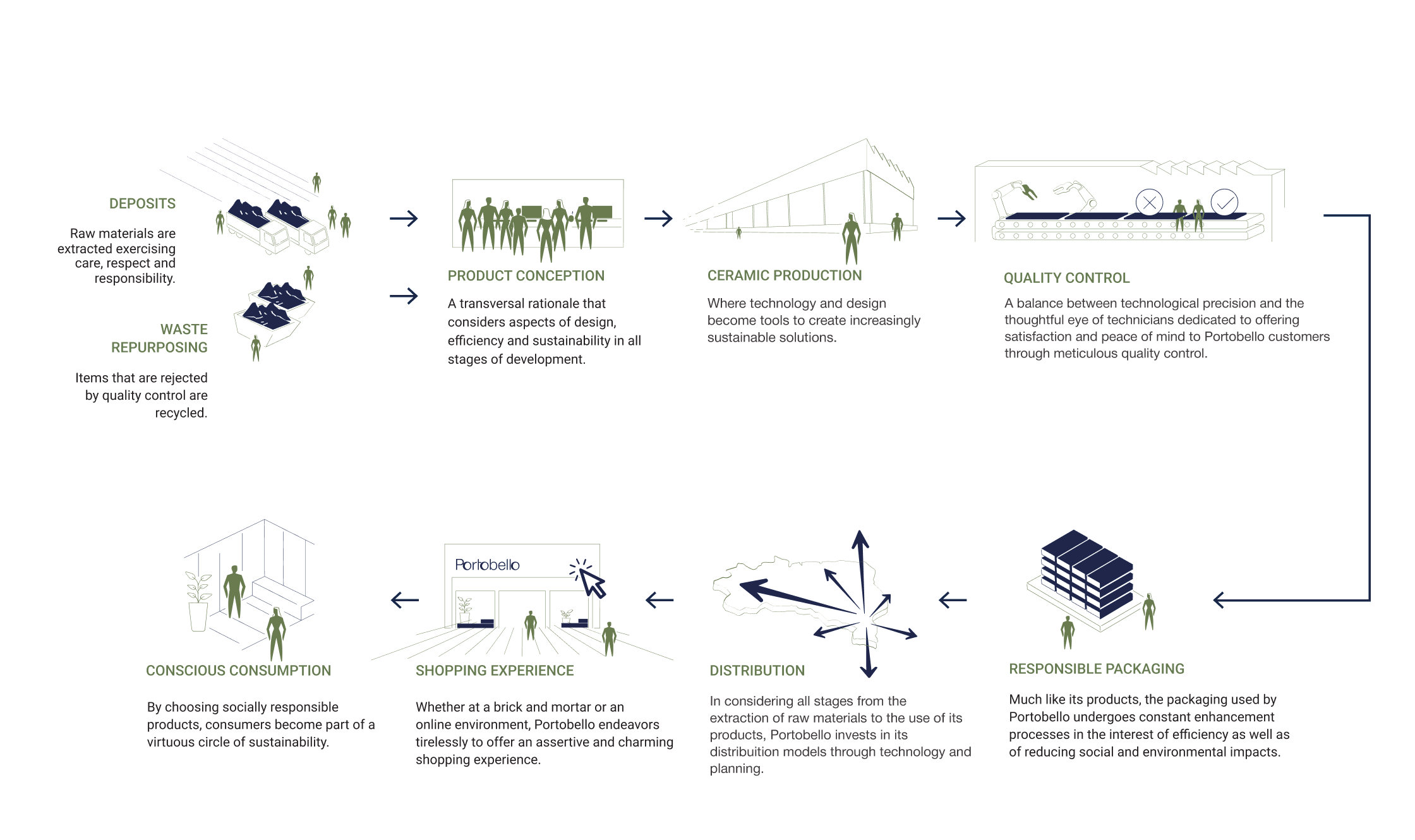 Sustainability for Portobello means being aware of our actions and the impact of our choices. It means understanding the responsibility that comes with being an integral part of our society and ecosystem. It means being committed to our entire production and distribution chain, aiming to create a future in which we can all evolve together.